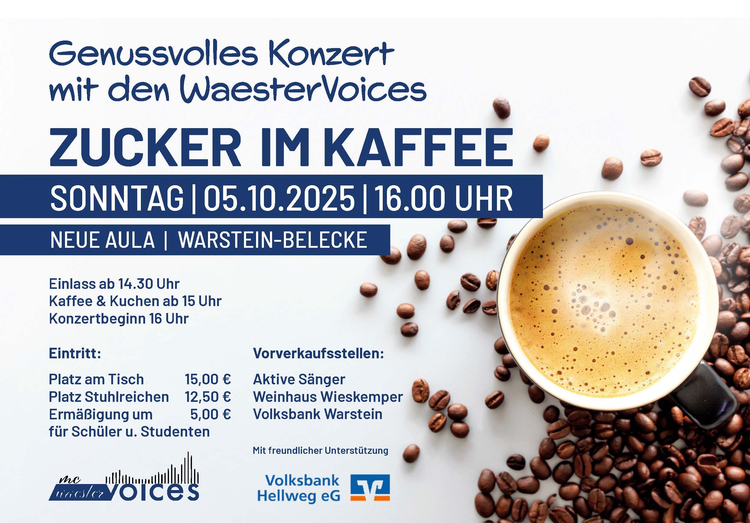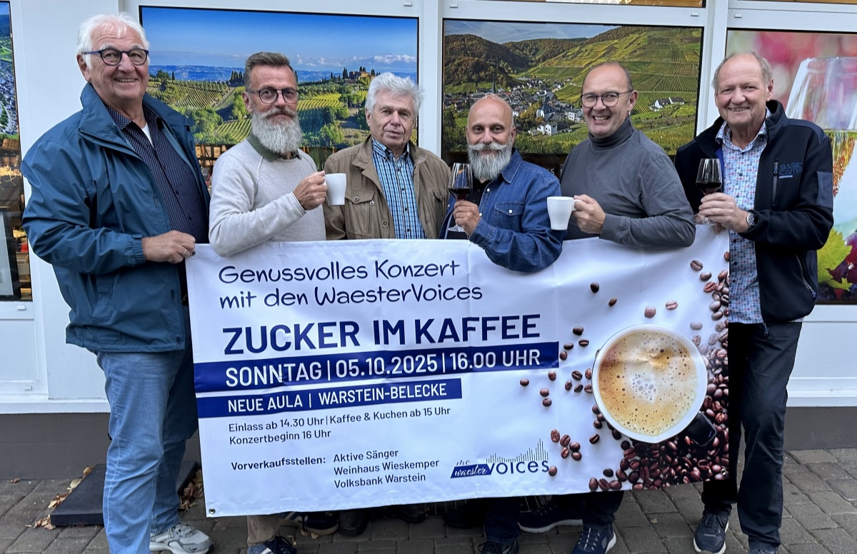 Der neu gegründete Männerchor WaesterVoices (ehemals MGV 1858 Warstein e.V. und MC Belecke 1860) veranstaltet am Sonntag, 5. Oktober, in der Neuen Aula in Belecke sein erstes großes Konzert. Unter dem Motto „Zucker im Kaffee – zuckersüß für die Ohren – kräftig im Abgang!“ erwarten das Publikum moderne Songs, gefühlvolle Melodien und musikalische Überraschungen. Von 15 bis 16 Uhr gibt es Kaffee und Kuchen. Um 16 Uhr beginnt das Konzert. Der Kaffee ist kostenlos, eine Mini-Weinprobe inklusive. Der Eintritt ist gestaffelt: am Tisch 15 Euro, in den Stuhlreihen 12,50 Euro. Einlass ist ab 14.30 Uhr. Karten gibt es in den Volksbank-Filialen Warstein und Belecke, im Weinhaus Wieskemper und bei den aktiven Sängern. Die beiden Vorsitzenden Rolf Jesse und Rolf Wieskemper hoffen auf reges Interesse aus dem gesamten Stadtgebiet für diesen „Nachmittag für alle Sinne“.