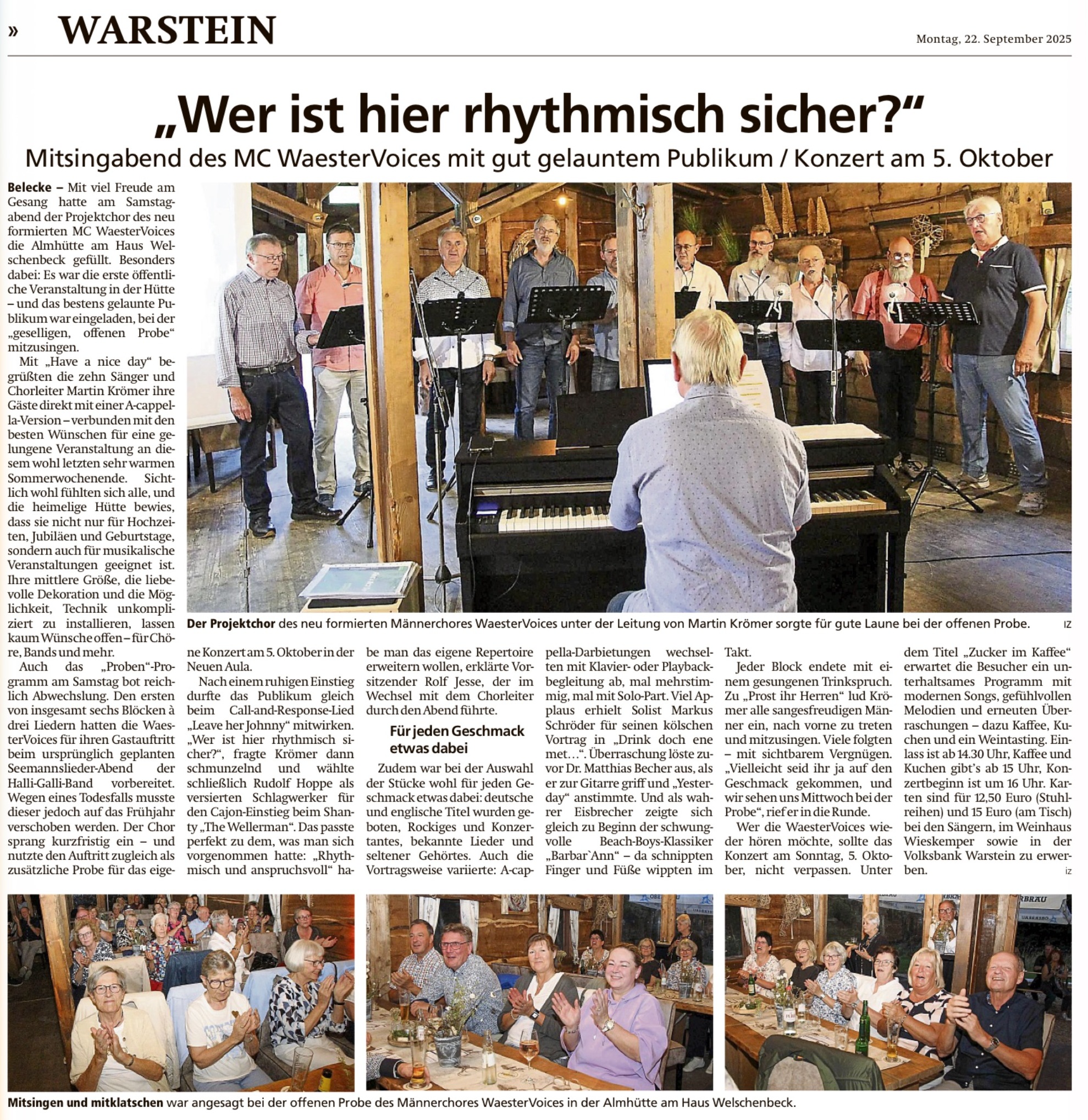 In der Mitgliederversammlung am 24.01.2025 haben sich die beiden Männerchöre aus Warstein und Belecke für eine gemeinsame Zukunft entschieden. Der neue Chor trägt den Namen „Waester Voices“ und symbolisiert den Zusammenhalt der Chöre und die Bereitschaft für Veränderungen. (s.a. Bericht im Soester Anzeiger vom 29.01.2025)